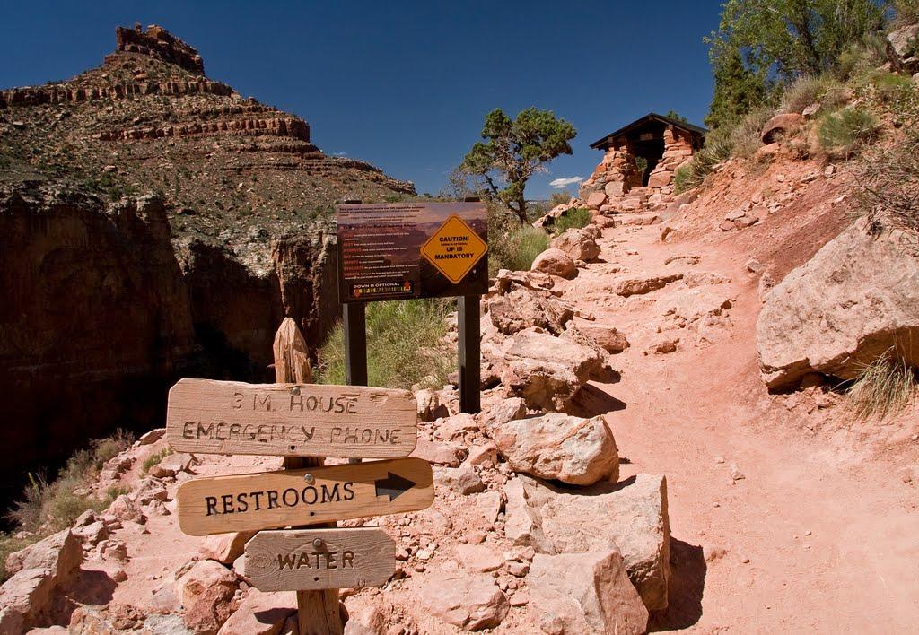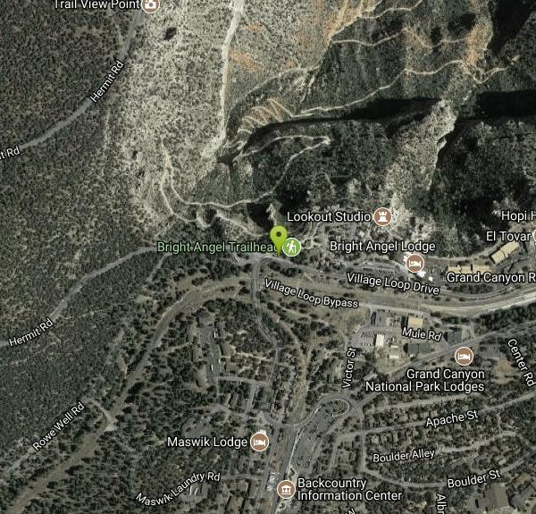 To reach the Bright Angel trailhead, located west of the Bright Angel Lodge you have two options, either park at Lot D at the Backcountry Information Center and walk 5 minutes to the trailhead, or park at the Grand Canyon Visitor Center and catch the free shuttle bus (:20 minutes one way). Courtesy of the National Park Service.