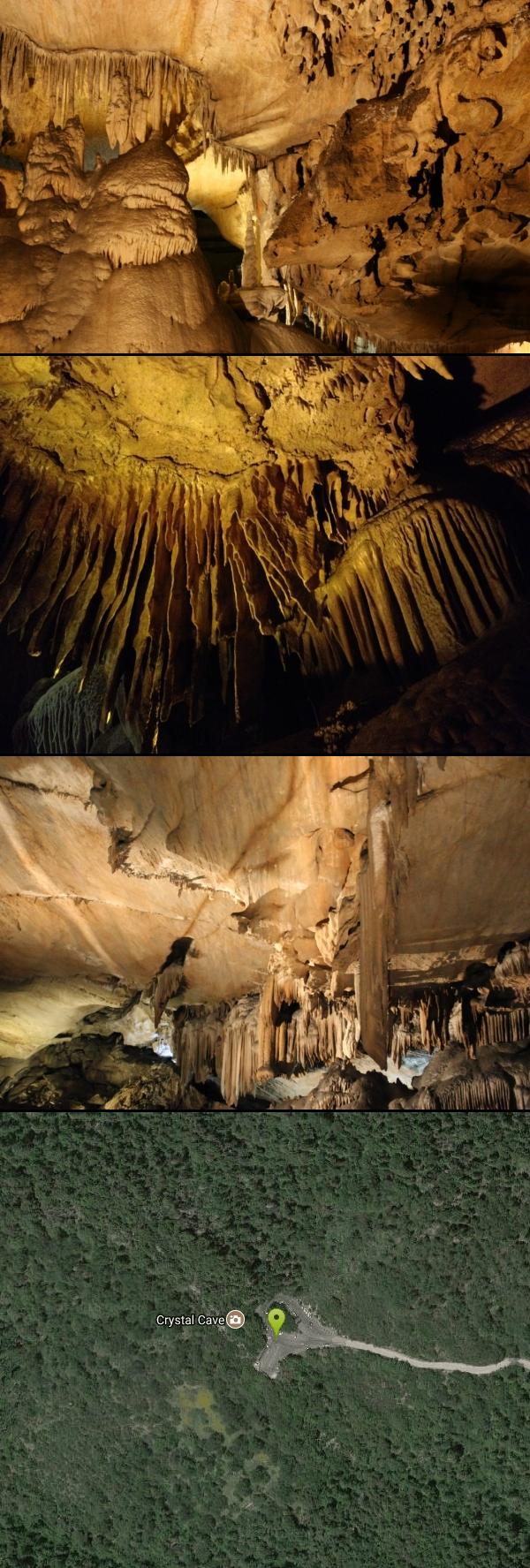 Within Crystal Cave visitors will be greeted by smooth marble walls and sparkling stalactites and stalagmites. Flowing through different parts of the caves are streams and lakes, which helped to erode the cave walls and allow the cavern to form over time. There is a lighted walkway through the cave that visitors take during the tour.