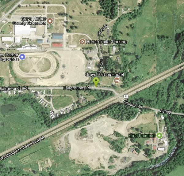 Corner of Hwy 8 and Fairgrounds Rd. Next to the Grays Harbor County Fairgrounds race track. 1 mile from downtown Elma to the east.Courtesy of DiscGolfUnited.com