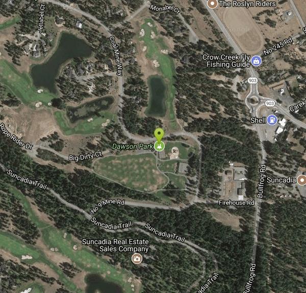 I-90 Eastbound; exit 84 - through Cle Elum to a right at 2nd light on Oakes St. Go over the RR tracks and across the freeway overpass to the 1st left on Whispering Pines Dr (looks like a driveway). Immediate left on Hanson Ponds Rd. On the left at the end of the road see the pond near hole 1. Look back up the road for the tee sign in the tree.Courtesy of DiscGolfUnited.com