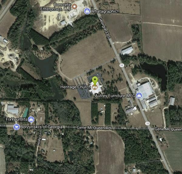 From Valdosta; NW on GA-133/GA-94/N St Augustine Rd. Stay on GA-133 to a left at GA-122. Right at Branch Rd/Tallokas Rd. Stay on Tallokas to a left at Gene McQueen Rd. Right at GA-33/S Main St. to Heritage Church on the left.Courtesy of DiscGolfUnited.com
