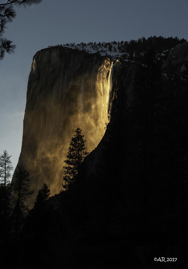 Horsetail Falls is located near El Capitan Valley in Yosemite. Around mid to late February, the fall gains popularity due to the way the orange glow of the sunset radiates off of it. In order to witness this "firefall" phenomenon, there has to be enough snowmelt for the water to flow, and the sky has to be clear. Even a small amount of clouds could reduce the effect or eliminate it altogether.