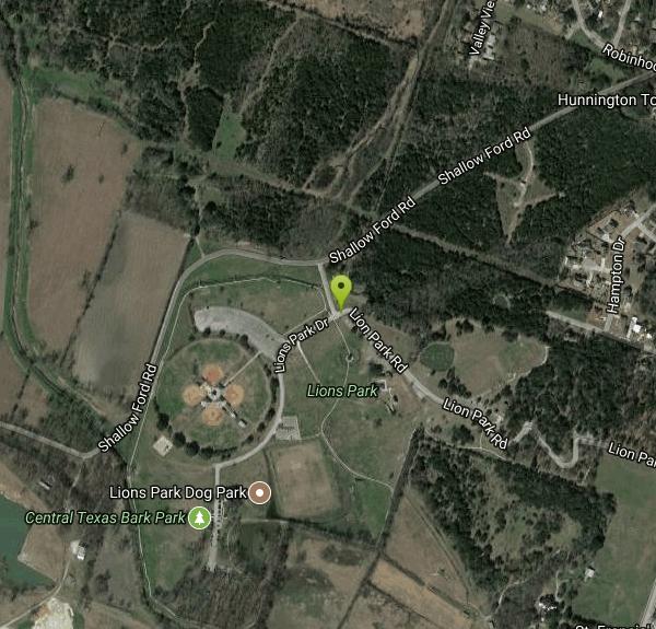 I-35 north to Midway exit. At light go east on Midway, then immediately right on Shallow Ford Rd., 1.7 miles to the park. Follow road around past pool to lot on left. 1st tee across road from pavilion on hill.Courtesy of DiscGolfUnited.com