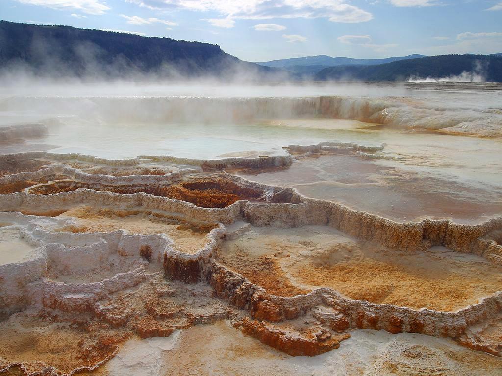 Mammoth Hot Springs is a unique sight in Yellowstone National Park. The soft limestone in this area allowed the water to form colorful terraces. The extremely hot running water is clear and smooth, covering the rock formations with a glistening surface.