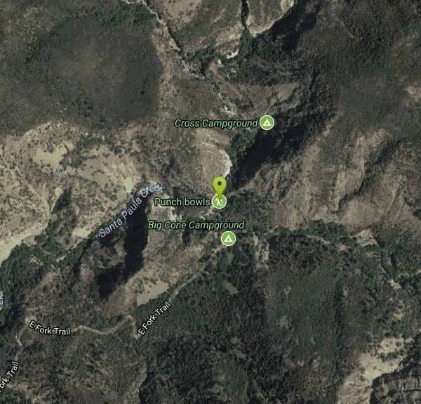 Located in the Santa Paula Canyon, the Punchbowls are a series of swimming holes. In order to reach the swimming holes, swimmers will have to hike about 3.5 miles one way from the Big Cone Campgrounds. There is a trailhead and trail swimmers will be able to follow. There is a large 25 foot waterfall flowing into the swimming holes, making it a beautiful place to go. Further up the trail are some natural slides the river makes as it tumbles towards the Punchbowls. The slides have varying degrees of difficulty, the most difficult one being very slick and fast, sending sliders close to a rock wall. Overall it is a beautiful place to visit with lots to do.