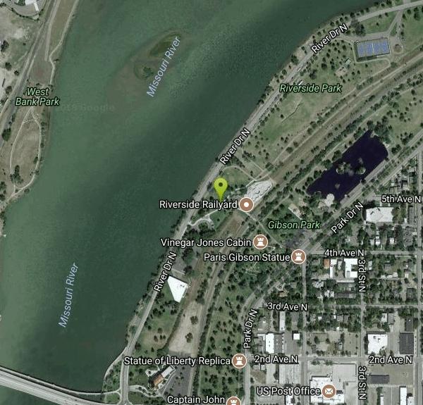 Riverside Railyard is located at 500 River Drive North in Great Falls. Directions: from Interstate 15, take the Central Avenue West exit; travel east on Central Avenue West until the light at River Drive (east end of the bridge); turn left on River Drive; follow River Drive for approximately 4 blocks; Riverside Railyard is on the right.Courtesy of skatepark.com