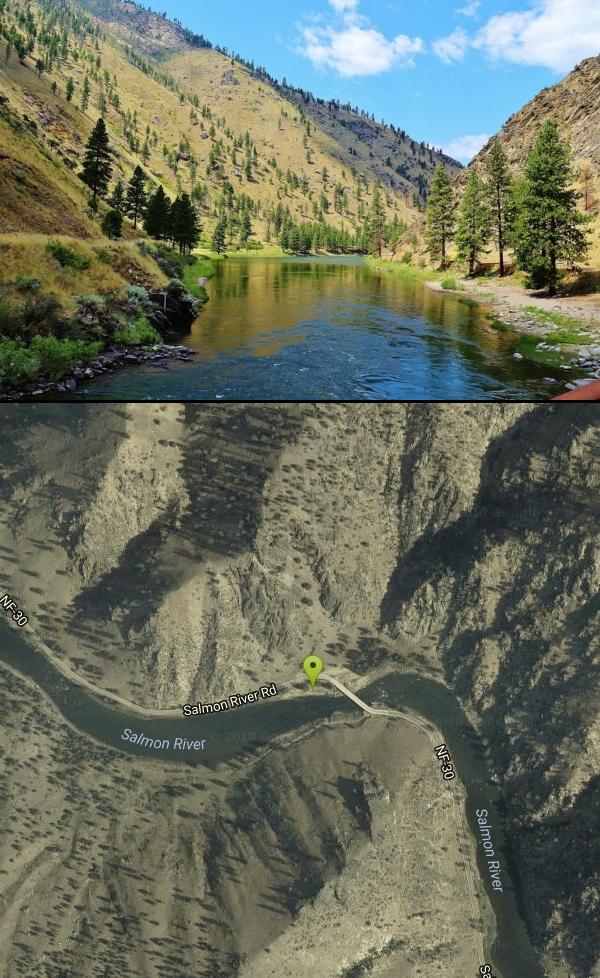 To get there: From Salmon, take RT 93 north to North Fork. Go west (left) on FR 030 past Shoup and past the bridge where Panther Creek Road (FR 055) goes off to the left (south). Continue on RT 030 west to where the road crosses a bridge over the Salmon River. Just past this bridge, still on FR 030, there is parking on the left and a large sandy beach