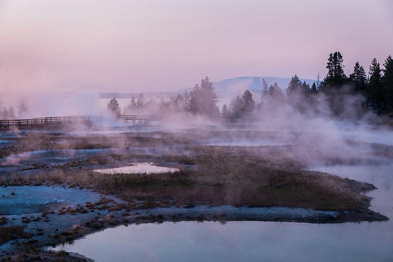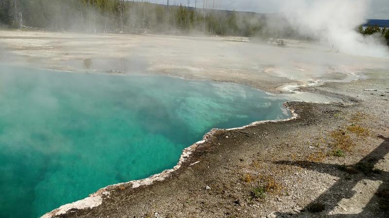 West Thumb Geyser Basin is one of the smaller geyser basins in Yellowstone, yet its location along the shore of Yellowstone Lake and is ranked as the most scenic. This area was formed by volcanic explosion that took place more than 150,000 years ago. After the volcano exploded, the area collapsed and filled with water over time. It gets its thermal abilities from the enclosed magma trapped in the ring fractures that developed over time.In the 1990's several underwater geysers were discovered. These geysers can be seen as bulges underground, especially during the summer months. The basin is also special because of its location in Yellowstone. The West Thumb Geyser Basin is located on the edge of Yellowstone Lake.